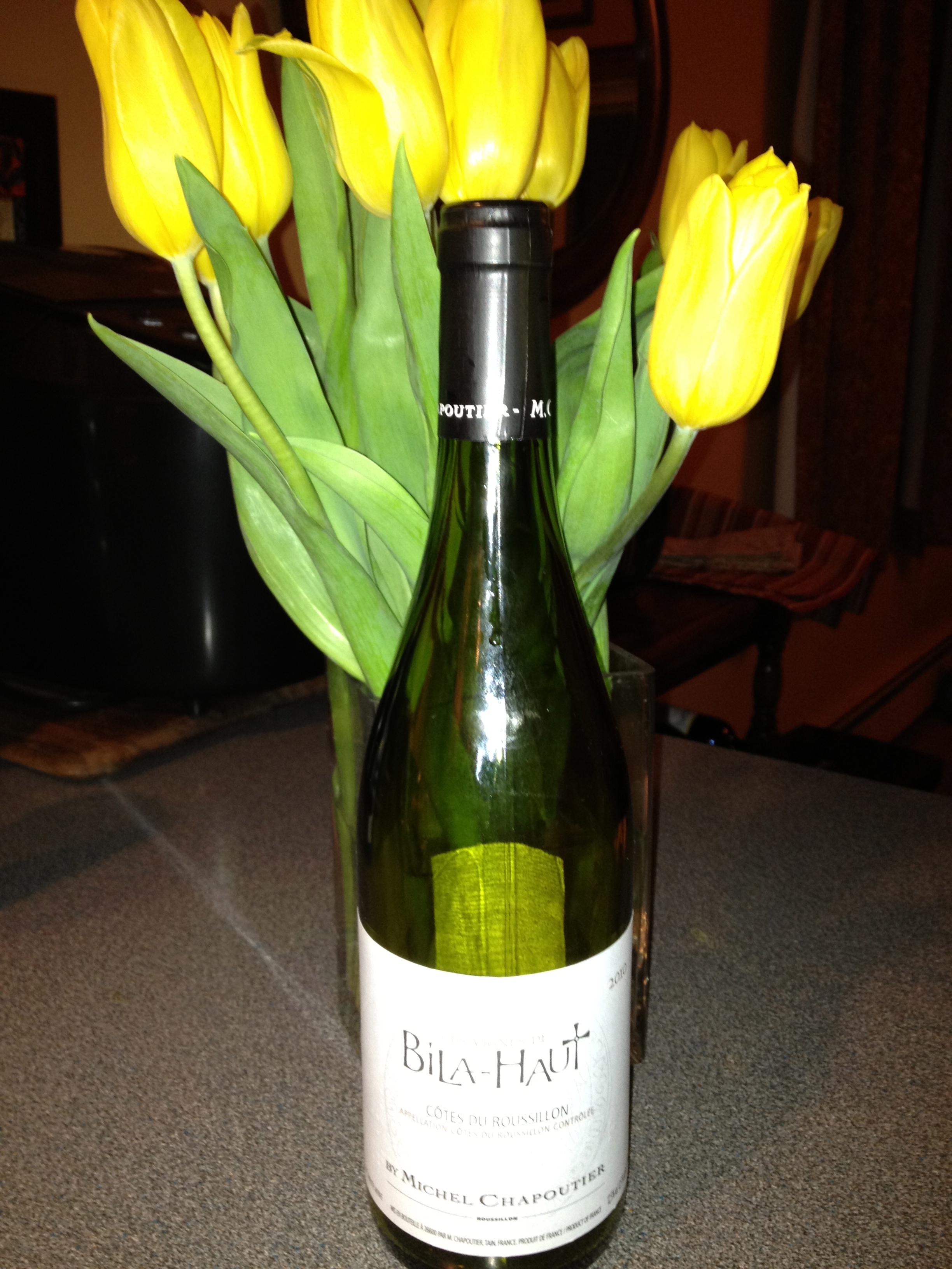 We are totally hooked on the 2010 Cotes du Roussillon Les Vignes de Bila-Haut, a French wine from the Lanquedoc Rousillon region. Again, I credit the folks at Bottle King for drawing our attention to this wine. They were having a tasting this fall, including several other reds and this white (all from Michel Chapoutier), and I thought this one the baddest of the bunch and grabbed up several. Here’s how the big shots from the Wine Advocate describe it (at 90 points):
