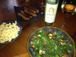 As the sultry summer slugs slowly onward, we decided preventative medicine would include a white wine along with our dinner tonight. We had an amazing meal (pictured below) of Italian turkey sausage, spiral pasta, and a warm vegetable salad that included organic rainbow chard, mushrooms, zucchini, and garlic. Our ongoing pinot parade required the performance of the DaVinci Pinot Grigio, on this occasion the 2010.