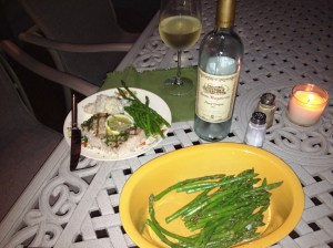 A delicious porch dinner included this 2011 Santa Margherita Pinot Grigio, probably our favorite white and the one to which all others are (at least presently) compared. Candle? Check. Ambiance? Check. Great company? Got that too. Our meal consisted of a couple of swordfish steaks, grilled to perfection, and some delicious garlic mashed potatoes and grilled asparagus with burnt butter and lemon sauce. Combined with the Santa Margherita, it all made for a great evening on the patio.