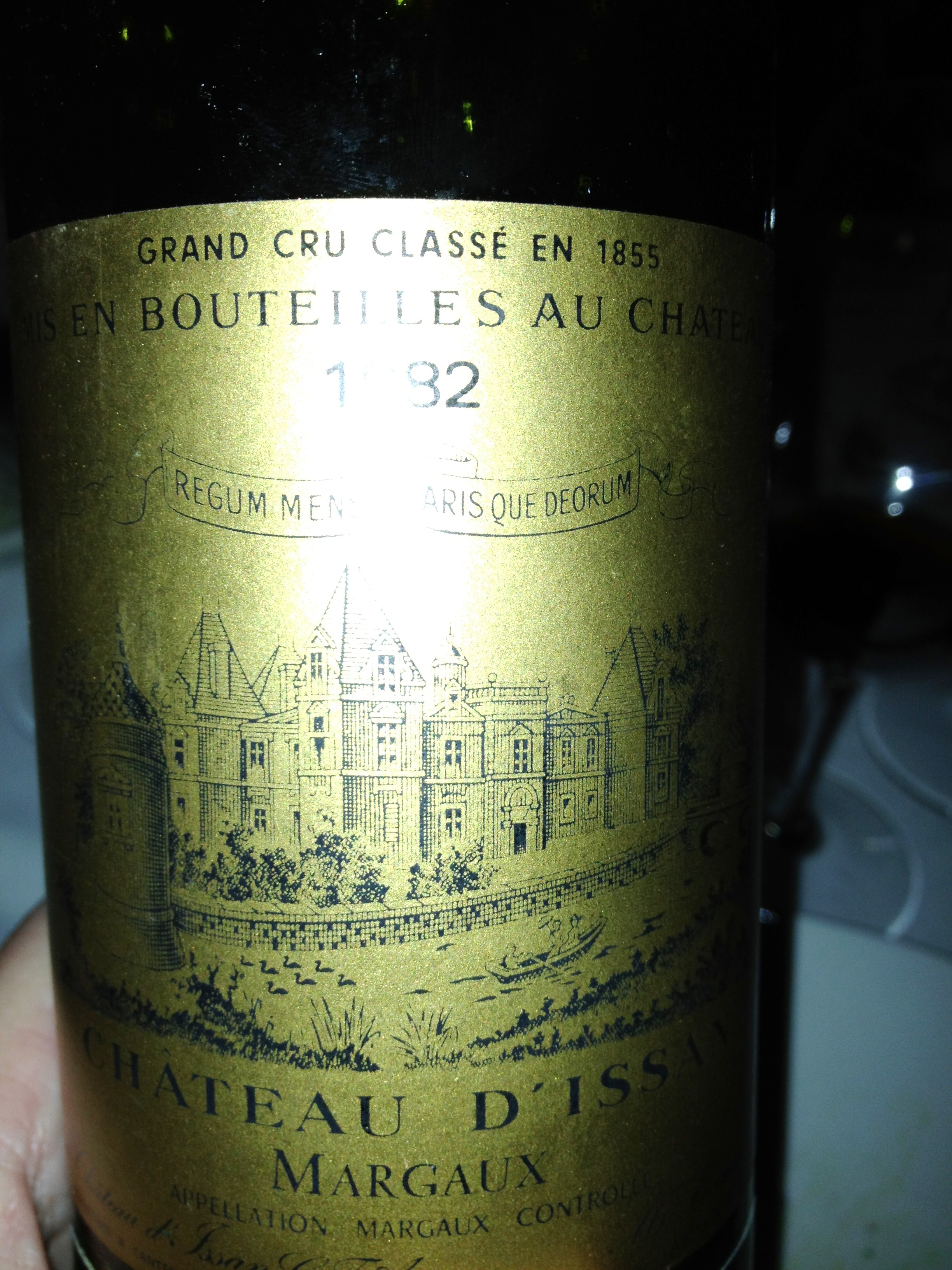 The 1982 Chateau d’Issan is a red blend from Margaux, an important appellation in the Haut-Medoc district of Bordeaux in southwestern France. Margaux has several chateaux around it, and each must abide to “Appellation Controlee” rules that stipulate where, when, and how wines must be made in order to warrant the AOC Margaux title. The region is famous for its production of well-rounded, gently perfumed wines–predominantly cabernet sauvignon.