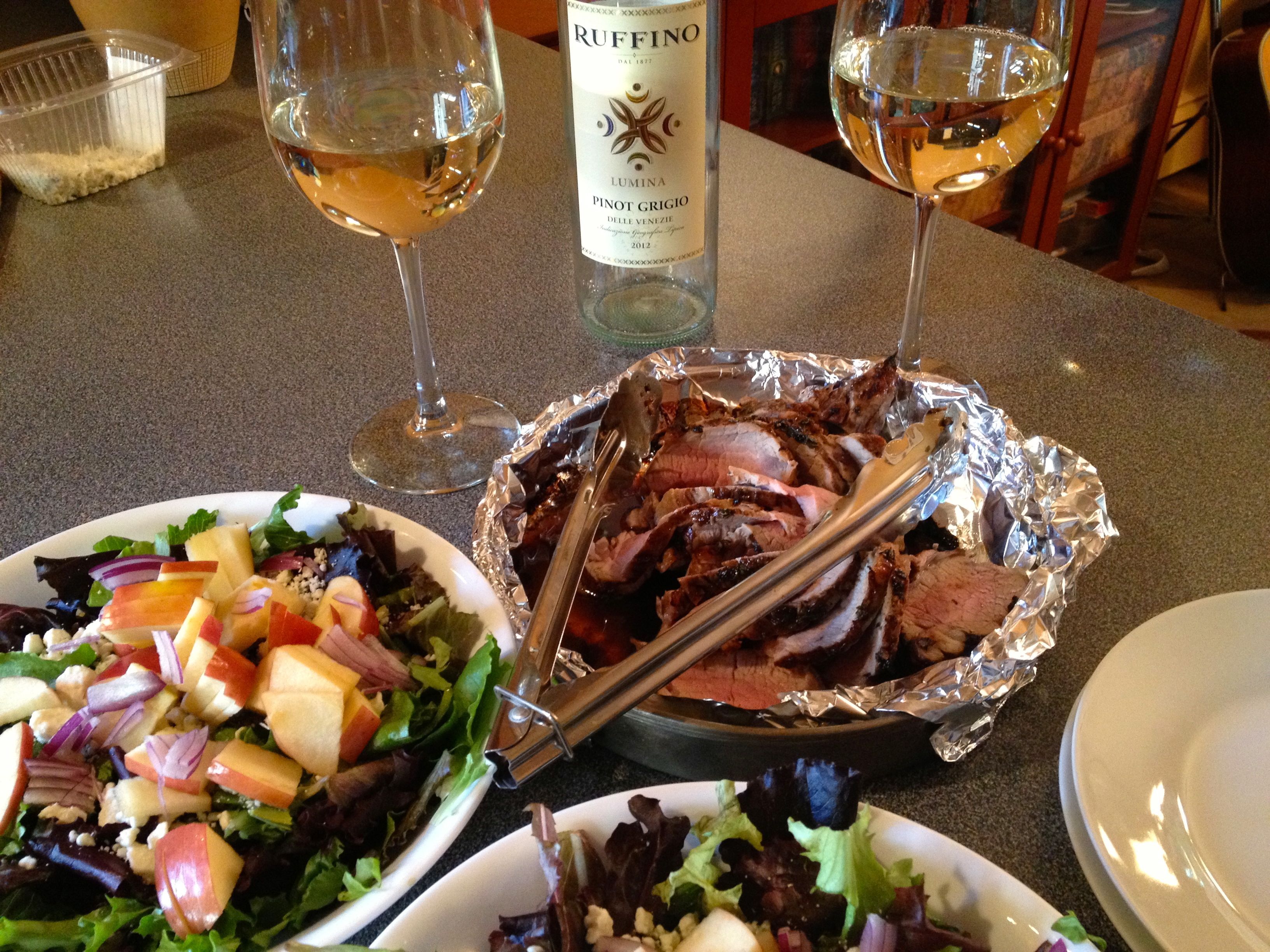 This was the prize at the end of a long day of road trippin’. My wife created a special occasion all our own when she pulled this Grigio from the fridge and made it a featured element in a light, enjoyable dinner. Pretty sure I’ve had the Ruffino before (maybe even wrote about that experience here?) but it couldn’t have worked as well as it did on this evening. The Ruffino, fruity and cool, accompanied a perfectly cooked pork loin and a fresh salad of mixed greens, onions, apple slices, and blue cheese. This white counterpunched well with the salad for sure and I loved that both of us were working the stemmed stuff.