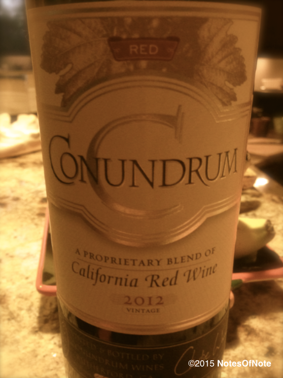 Two great conundrums on how to celebrate my April 7th: 1) which of so many delicious wine bottles to open, and 2) this 2012 Conundrum Red Wine, a birthday gift from my lovely bride. I’ve seen the catchy branding and enjoyed the word play on many occasions but this was the first time I actually got to sample this proprietary red blend.