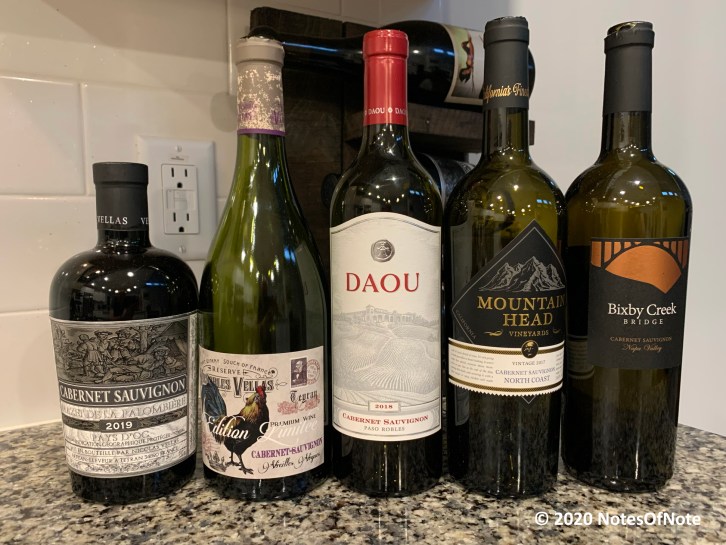 2019 Mazet de la Palombiere Cabernet Sauvignon, Cabardes, Languedoc-Roussillon, France; 2019 Vienobles Vellas Cabernet Sauvignon, Mas du Pont, France; 2018 Daou Cabernet Sauvignon, Paso Robles, California, USA; 2017 Cabernet Sauvignon, Mountain Head Vineyards, North Coast, California, USA; 2017 Cabernet Sauvignon, Bixby Creek Bridge, Napa Valley, California, USA.