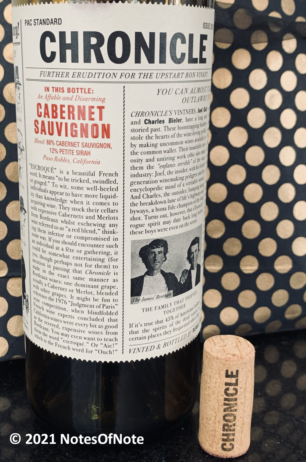 The attributes of this wine line right up to the preferences of this oenophile. The 2018 Chronicle is produced on California’s North Coast, it’s a blend of Cabernet Sauvignon (88%) and Petite Sirah (12%), and has an intriguing label that just may include an individually numbered bottle. Let’s dig deeper…