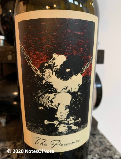 Here is The Prisoner in the winemaker’s own remarks: “Bold aromas of black cherry and plum are heightened by hints of oak and Madagascar vanilla. A soft and velvety palate of anise, dark cocoa powder, and roasted sage lead into a dense finish with luscious tannins.”